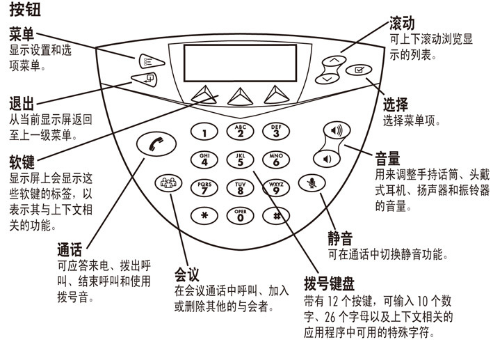 3個功能鍵,包括:重撥鍵、保持鍵、會議編程鍵